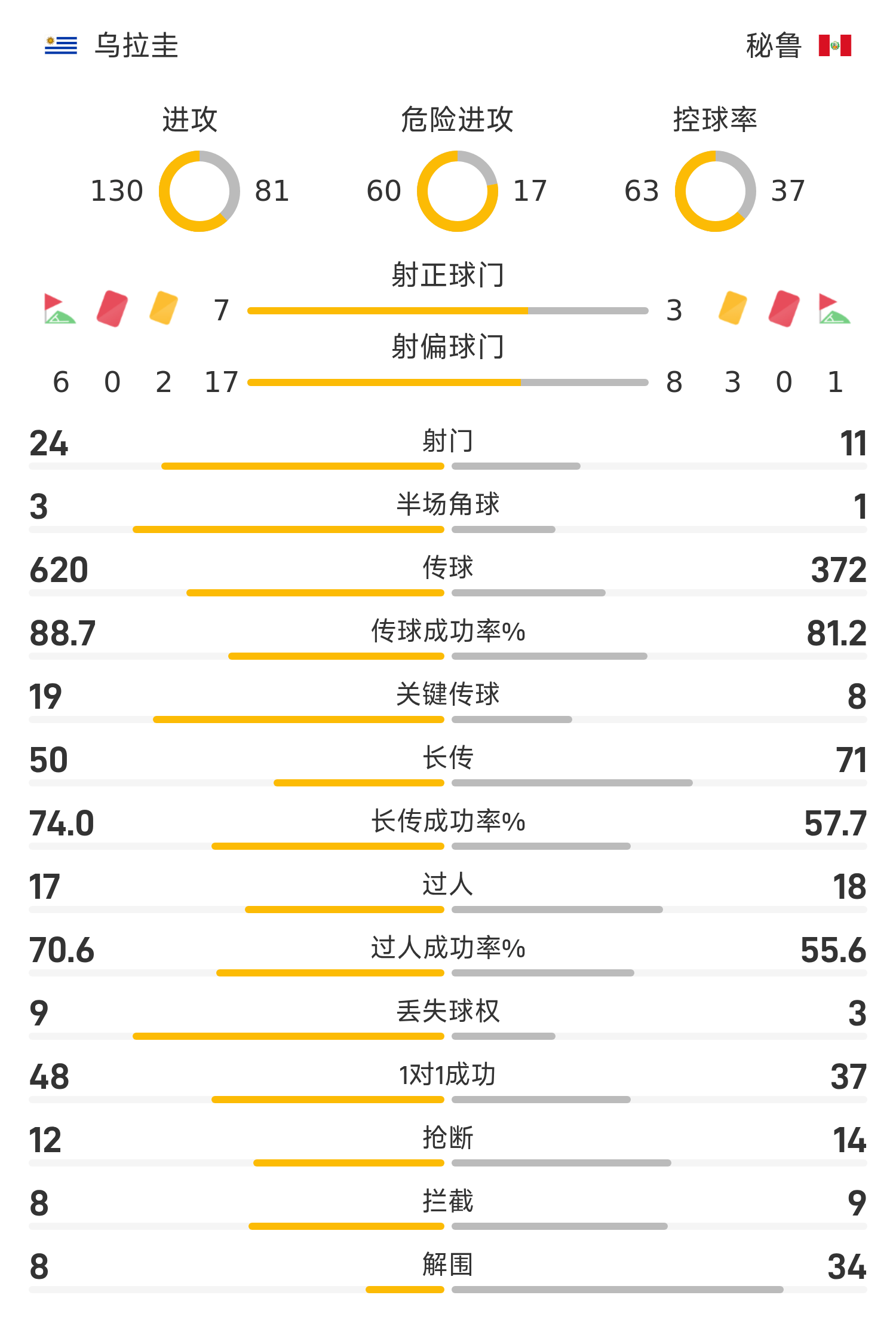 乌拉圭首发阵容:1-罗切特、13-巴雷拉、16-奥利维拉、22-皮克雷斯、3-卡塞雷斯、10-德阿拉斯凯塔(69’5-乌加特)、6-本坦库尔、15-巴尔韦德、7-阿吉雷(74’9-维纳斯)、18-罗德里格斯、11-佩利斯特里(77’21-扎拉扎尔)