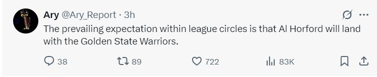 根据美记Ary的报道,联盟内部人士普遍认为艾尔-霍福德最可能加盟金州勇士队。