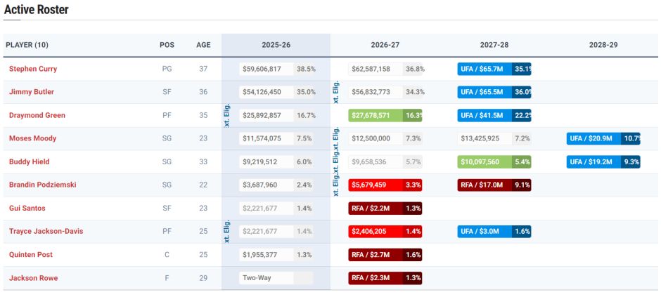 目前勇士队大名单是9人:库里、巴特勒、追梦、穆迪、希尔德、波杰、桑托斯、戴维斯、波斯特;他们比湖人还惨,湖人至少签了拉拉维亚、艾顿大名单已经凑到13人。